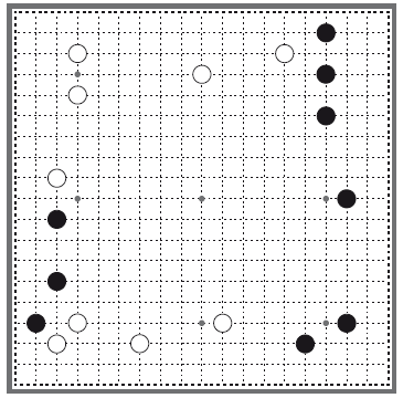 Теперь обратим внимание на белые камни. Мы видим, что пять белых наверху огораживают довольно обширное пространство: большой угол слева, почти всю верхнюю сторону и верхнюю часть левой стороны. Белые камни, расположенные на нижней стороне игрового поля, огораживают часть нижней стороны вместе с нижним левым углом.