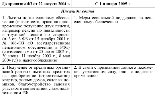В целях наглядности перемен в правовом статусе рассматриваемой категории граждан, упрощения понимания произошедшего в связи с принятием так называемого Закона о монетизации льгот, рассмотрим изменения в действующем законодательстве в виде сравнительной таблицы. Данные последней будут составлять соответственно прежние льготы и будущие социальные гарантии для каждой категории лиц, на которых распространяет свое действие Закон о ветеранах.