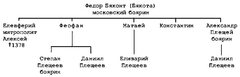 У боярина Федора Бяконта было пять сыновей: Елевферий, Феофан, Матвей, Константин и Александр Плещей. Феофана можно считать несомненным боярином, Матвея – вероятным, а служба младшего сына, Александра Плещея, относится, по-видимому, к княжению Дмитрия Донского.