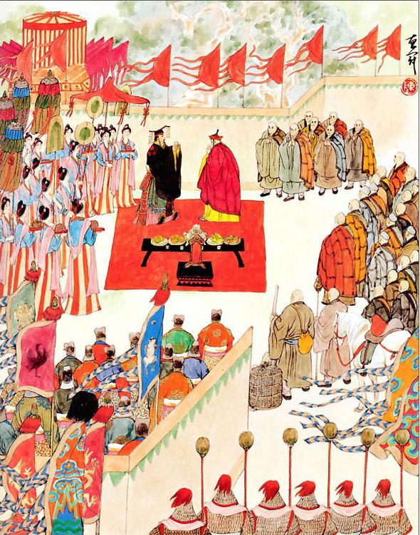Вид величавый храму придавалоСвеченье золота средь мягкой полутьмы,Толпа пришельцев стройно распевалаБуддийские священные псалмы.И в барабан стуча, служитель старыйВесь дружный хор всегда сопровождал,И много было у высоких статуйЦветов и фруктов, принесенных в дар.Здесь изобилье яств – в больших сосудахРасставлены на длинные столы,И сладкий дым струится из курильниц,Клубился он, заполнив все углы.Здесь пламени спокойное гореньеВ затейливых подсвечниках литых,Здесь обретают все успокоеньеОт проповедей ясных и святых…Густой и белый – вдруг туман спустился,Чтоб на верхушки сосен мягко лечь,И демон злобный головы лишился, –И вот уж убран всемогущий меч.Бодисатва оправил на себе одежду и пошел навстречу гостю. После этого Сунь У-куна подвели к столу, пригласили занять почетное место и тотчас же приказали подать чай.