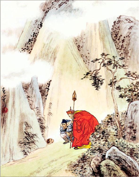 Сунь У-кун предложил учителю выйти из монастыря и помог ему сесть верхом. Чжу Ба-цзе взял коромысло с вещами, а Ша-сэн повел коня.