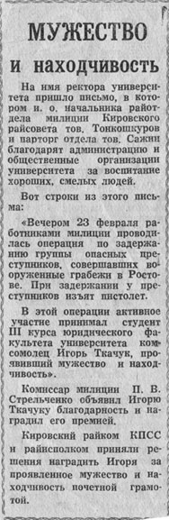 Возвращаясь в прошлое, с благодарностью вспоминаю о знакомстве изнутри с кухней оперативно-розыскной деятельности в качестве внештатного оперуполномоченного отделения уголовного розыска Кировского РОМ. В те годы областное и районное милицейское руководство рассматривало внештатников из числа студентов юрфака, как весомую вспомогательную часть оперативных сил. Поощрительное отношение к взаимодействию штатных сотрудников со студентами – юристами определялось партийными установками на расширение участия общественности в охране порядка. К тому же, студентам старших курсов, обладавшим правовыми познаниями и навыками подготовки документов, можно было доверить часть доследственной писанины по проверочным материалам, высвободив время оперов-практиков для других насущных задач. И наконец, к студентам присматривались, как к возможным кандидатам на пополнение милицейских рядов.