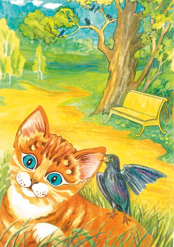 SHADY SHADELittle red kitty was walking around,Singing hilarious songlet aloud.Sunshine and blue sky – the day was so great,Under the bush – shade!Starling was flying and looking for bugs.Red kitty saw him and gave him warm hugs.Cried to the starling: «Mew! Hey you, hey you,How old are you? Mew!»Chorus:Shade, shade, shady shade,Walking is so great.Day-day, ding-dong day,Cheerful sunshiny day.Starling is kitty’s best friend now – good guy,Kitty – believe me – has learned how to fly.Starling meows every morning aloud,Both friends are so proud.