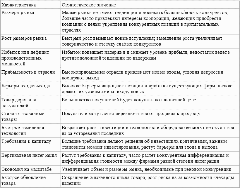 Целесообразно составить «портрет» отрасли по этим характеристикам и затем его проанализировать. Для этого в табл. 1. приведены данные по стратегической важности отдельных экономических характеристик.