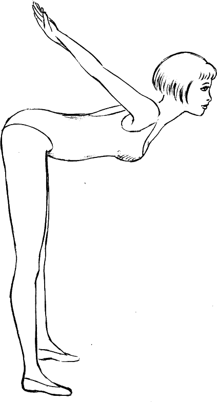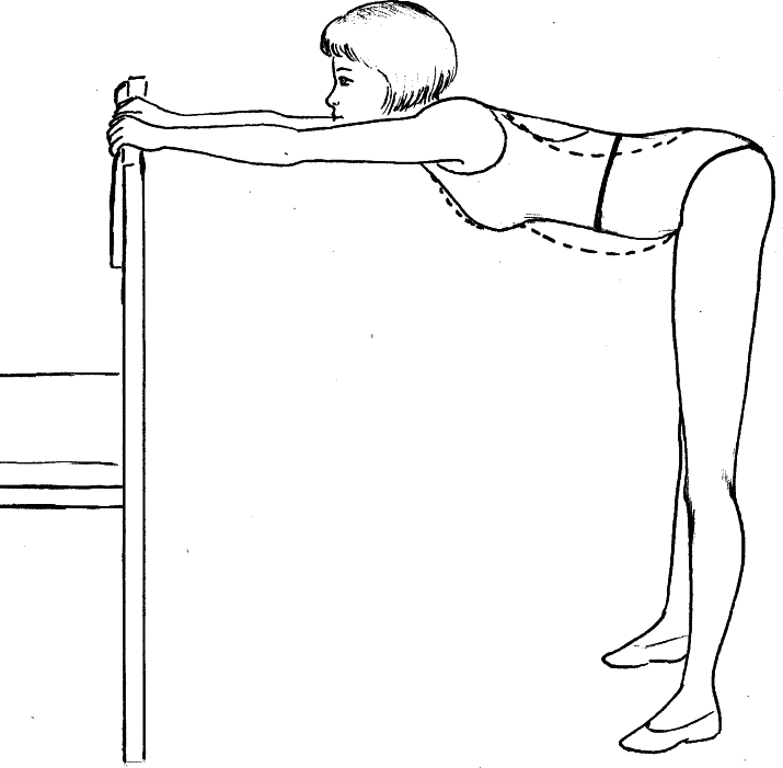 2. Встаньте перед стулом на расстоянии двух шагов от него, слегка расставив ноги. Выпрямите туловище и прогнитесь, опираясь на руки. Руки в локтях держите выпрямленными, спину – прямой, голову – слегка поднятой вверх. На счет «раз», «два», «три» прогните позвоночник. На счет «четыре», «пять», «шесть» вернитесь в исходное положение. Дышите ритмично. Повторите 4–6 раз.