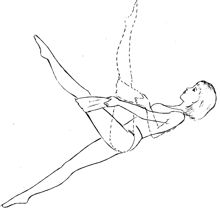 4. Фигурное катание на полу. Лягте на спину. Руки поднимите вверх, колени согните. Перекатитесь сначала на правый бок. Голову при этом поверните в обратную сторону. Затем перекатитесь на левый бок.