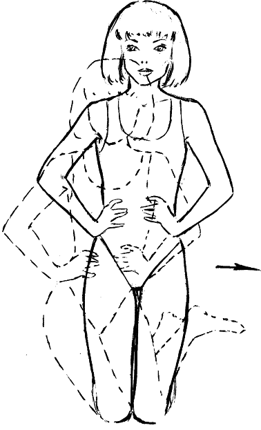 3. Исходное положение – стоя, руки на поясе. Слегка приседая, сделайте горизонтальный круг коленями вправо. Вернитесь в исходное положение. Повторите то же в другую сторону.