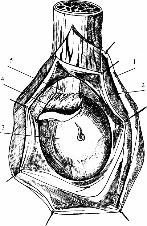 Рис. 3. 1 – кожа; 2 – белочная оболочка; 3 – яичко; 4 – придаток яичка; 5 – семенной канатик