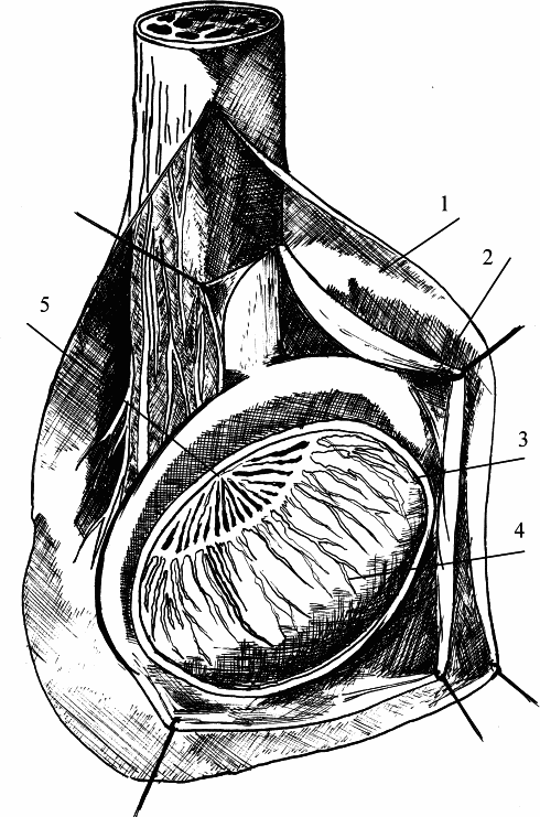 Рис. 1. 1 – яичко; 2 – придаток яичка; 3 – кожа; 4 – белочная оболочка яичка; 5 – средостение яичка