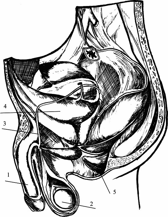 Рис. 5. Семявыносящие протоки. 1 – половой член; 2 – яичко; 3 – мочеточник; 4 – мочевой пузырь; 5 – анус
