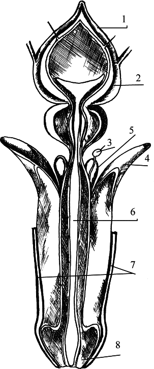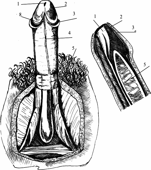 Рис. 8. Половой член. 1 – мочевой пузырь; 2 – мышечная оболочка мочевого пузыря; 3 – бульбоуретральные железы; 4 – основание полового члена; 5 – луковица полового члена; 6 – мочеиспускательный канал; 7 – кожа; 8 – головка полового члена