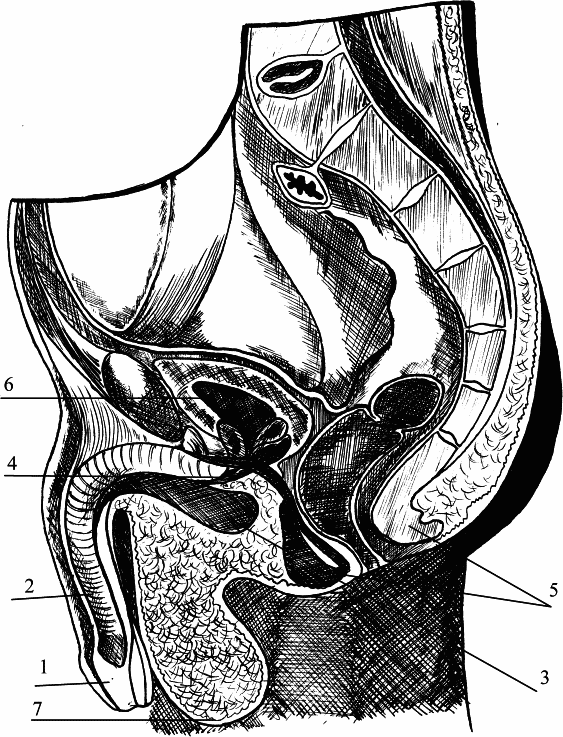 Рис. 7. Семенные пузырьки. 1 – головка полового члена; 2 – кавернозное тело; 3 – луковица полового члена; 4 – семенные пузырьки; 5 – кости таза; 6 – мочевой пузырь; 7 – мошонка