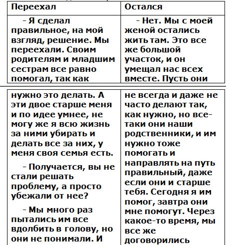 Наша мать даже не надеялась ни на сестру мою, ни на ее мужа, потому что от них помощи ноль было. Она больше надеялась на мою жену, матери даже было легче подойти и попросить ее о помощи, нежели мою старшую сестру. Как говорит Гриша: «Если я не вижу в этом смысла, я помогать не буду». Может, поэтому, и живут вместе, несмотря на тараканы в их головах.