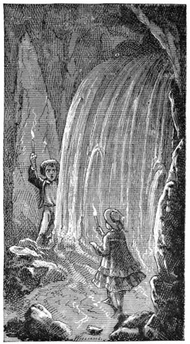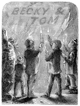 to return to Tom and Becky’s share in the pic-nic. They tripped along the murky aisles with the rest of the company, visiting the familiar wonders of the cave – wonders dubbed with rather over-descriptive names, such as “The Drawing-Room,” “The Cathedral,” “Aladdin’s Palace,” and so on. Presently the hide-and-seek frolicking began, and Tom and Becky engaged in it with zeal until the exertion began to grow a trifle wearisome; then they wandered down a sinuous avenue holding their candles aloft and reading the tangled web-work of names, dates, post-office addresses, and mottoes with which the rocky walls had been frescoed (in candle-smoke). Still drifting along and talking, they scarcely noticed that they were now in a part of the cave whose walls were not frescoed. They smoked their own names under an overhanging shelf and moved on. Presently they came to a place where a little stream of water, trickling over a ledge and carrying a limestone sediment with it, had, in the slow-dragging ages, formed a laced and ruffled Niagara in gleaming and imperishable stone. Tom squeezed his small body behind it in order to illuminate it for Becky’s gratification. He found that it curtained a sort of steep natural stairway which was enclosed between narrow walls, and at once the ambition to be a discoverer seized him.