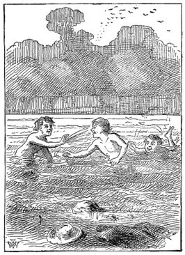 They sprang to their feet and hurried to the shore toward the town. They parted the bushes on the bank and peered out over the water. The little steam ferry-boat was about a mile below the village, drifting with the current. Her broad deck seemed crowded with people. There were a great many skiffs rowing about or floating with the stream in the neighborhood of the ferry-boat, but the boys could not determine what the men in them were doing. Presently a great jet of white smoke burst from the ferry-boat’s side, and as it expanded and rose in a lazy cloud, that same dull throb of sound was borne to the listeners again.