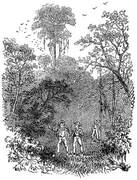 They lay around in the shade, after breakfast, while Huck had a smoke, and then went off through the woods on an exploring expedition. They tramped gayly along, over decaying logs, through tangled underbrush, among solemn monarchs of the forest, hung from their crowns to the ground with a drooping regalia of grape-vines. Now and then they came upon snug nooks carpeted with grass and jeweled with flowers.