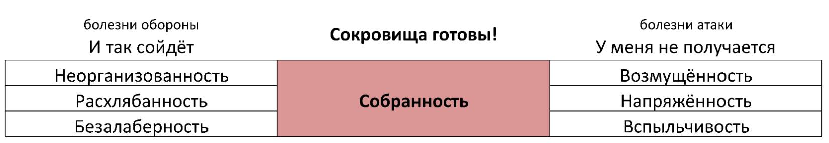 Но тут вот какой парадокс. Вы бы и рады реализовывать себя, но «Где взять нужные сокровища? У меня их нет», – говорите Вы. Здесь выше описано 3 вида сокровищ – сколько Вы можете назвать своих? Часто Вы их либо не знаете, либо не считаете таковыми. Поэтому, когда возникает ситуация, в которой Собранности бы включить нужный «рисунок» сокровищ, чтобы Вам быть готовыми, а не из чего.