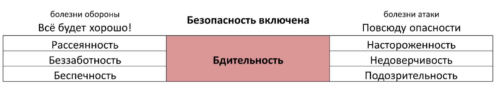 Бдительность – телохранитель человека на пути к своему желанию. Она всегда начеку, всегда в деле, меняя лишь интенсивность своей работы. Бдительность указывает человеку на угрозы, которые могут появится или уже стоят на его пути. Например, оператор на почте просит у Вас паспорт, чтобы выдать посылку. Бдительность говорит ему: «Проверь документ, потому что если ты выдашь не тому, то можешь лишиться работы. А он хочет работать».