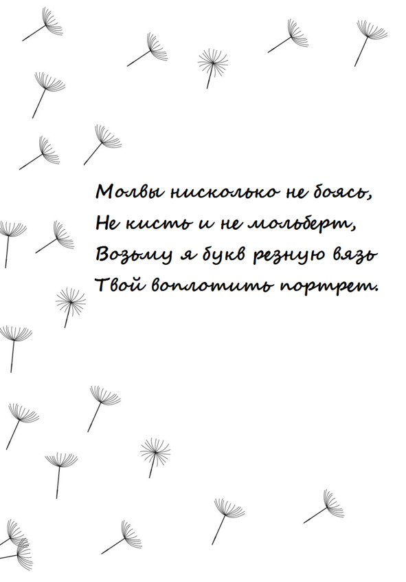 Молвы нисколько не боясь,Не кисть и не мольберт,Возьму я букв резную вязьТвой воплотить портрет.Любуюсь каждою чертой.Могу смотреть часами,Как тонких губ изгиб крутойВ полуулыбке замер,Как украшая карий взор,Бегут к вискам морщины,И как в причудливый узорСплетается щетина.Мне серебро твоих волосВ разы дороже смоли.Гляжусь в тебя порой до слез,Порой до жгучей боли,И насмотреться не могу.Не застит взор усталость.За днями дни бегут, бегут…Я все смотрю… Мне мало…Мое милое счастье