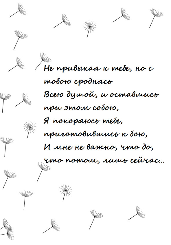 Волосы упрямою волной,Как ни собирай, укроют плечи,Повторяя нрав несносный мой.Да, возможно, что с другими легче.Что с того? Ведь выбрал ты меня.А за что, не стоит выяснять.Аутотренинг