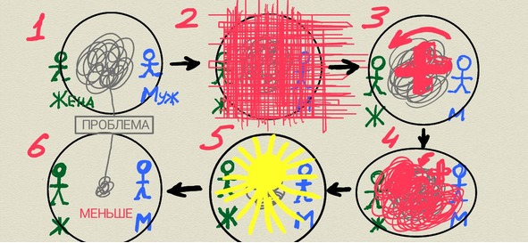 Рисуем себя и мужа, рисуем нашу проблему. Как? Интуитивно. Ваш мозг точно знает, в чем проблема, знает на подкорке, эту проблему даже не надо себе озвучивать, рука сама нарисует эту проблему в виде каракулей между вами. Каракули будут именно эти.