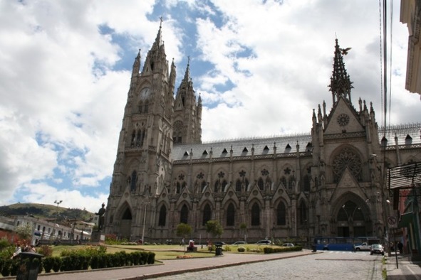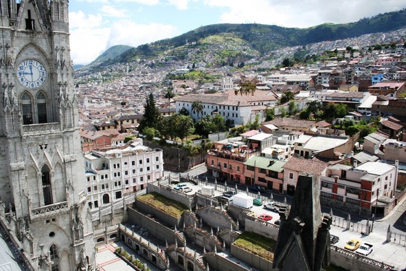 Рассчиталась, собрала вещи, оставила в камере хранения хостела. Свободного времени у меня было часа 4, и я отправилась в старый город, чтобы забраться на смотровую площадку базилики Храма дель-Вото-Насьональ. Храм видно почти отовсюду в городе, также как и статую Девы Марии, установленную на холме. Вместо страшных горгулий – дружелюбные звери, обитатели местной сельвы. Внутри – собор, с другой стороны – музей и гробница. Наверху – витражи, переход под крышей с дырочками, в которые проникает свет, образуя причудливые созвездия, к башням, выход на смотровую, возможность забраться на базилику.