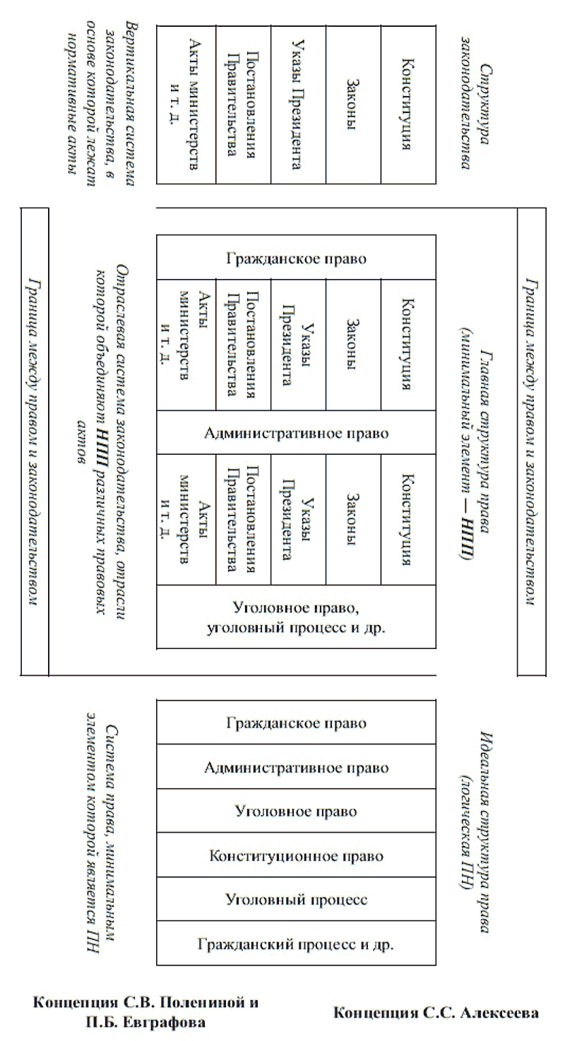 Достаточно показательным представляется тот факт, что рассмотренная выше концепция С. С. Алексеева содержит, в принципе, сходный взгляд на проблему. По сути, ученые предлагают аналогичные схемы с той только разницей, что один помещает ее в систему права, а другие – в систему законодательства.