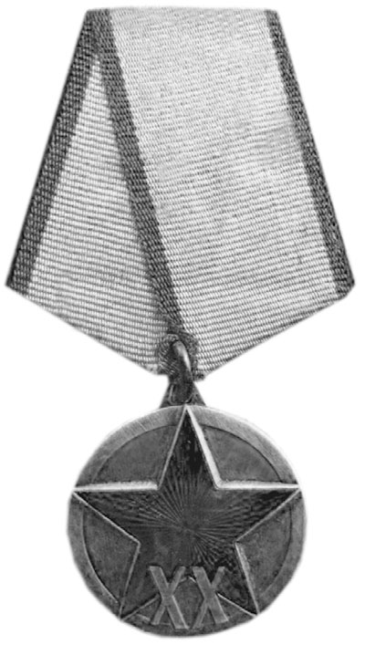 Этой медалью награждали лиц кадрового командного состава Рабоче-крестьянской Красной Армии и Военно-морского флота, прослужившего в рядах РККА и ВМФ двадцать лет, и заслуженных участников Гражданской войны, состоящих в кадрах, награждённых орденом «Красное Знамя» за боевые отличия в годы Гражданской войны.