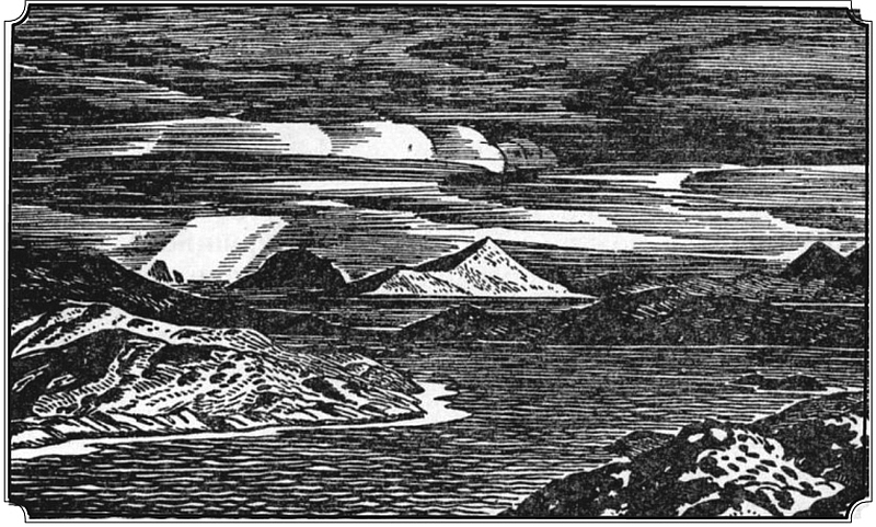 Потрудившись еще немного, путешественники добрались до торфяника, а затем и до обнаженной сланцевой породы. С вершины холма они обнаружили, что воды по его склонам текут к морю в разных направлениях. Перед ними широко открывалась окрестная местность: к северу простиралось топкое болото, зато к югу поднимался дикий величественный пейзаж, подобающий земле Блуждающих Огней. Путники застыли в изумлении, пораженные таинственным величием представшей перед ними картины: гора возвышалась за горой, вершина – за вершиной. Казалось, не будет конца этому нагромождению скалистых гор, прорезанных глубокими долинами. И все покрывал густой, темный лесной массив. Даже воздух в этом климате, где штормы с дождем, градом и мокрым снегом сменяют друг друга, казался темнее, чем повсюду в других местах. Отдалённые каналы с отвесными берегами, сетью бесчисленных ответвлений, отделяющих друг от друга острова и островки архипелага, кажутся мрачными, такими мрачными, будто ведут за пределы этого мира.