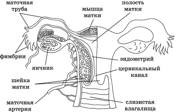 Матка представляет собой орган, состоящий из мышечной и соединительной ткани, по величине и форме напоминающий яйцо. Различают тело и шейку матки (см. рис. 2). Шейка матки имеет цилиндрическую форму и соединяет матку с влагалищем. Матка – это полый орган. Полость матки имеет форму треугольника, расположенного основанием кверху. Изнутри матка выстлана особой эпителиальной тканью – эндометрием, который меняется в зависимости от уровня гормонов яичника. Основное предназначение матки – послужить резервуаром для вынашивания плода, старые акушеры так ее и называли – плодовместилище. Во время беременности матка увеличивается в размере в десятки раз, стенка ее утолщается, возникают новые кровеносные сосуды.