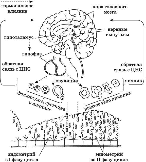 В коре головного мозга вырабатываются нервные импульсы и некоторые активные вещества, воздействующие на гипоталамус, в котором производятся так называемые рилизинг-гормоны, регулирующие функцию гипофиза. Гипофиз выделяет еще несколько гормонов, точкой приложения которых являются яичники. Яичники представляют собой уникальные органы, выполняющие двойную функцию: именно в них растет и созревает материнская часть зародыша – яйцеклетка. Кроме того, яичники производят свои гормоны, оказывающие влияние на слизистую оболочку полости матки, шейки матки, влагалища, а также другие органы и системы организма.