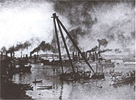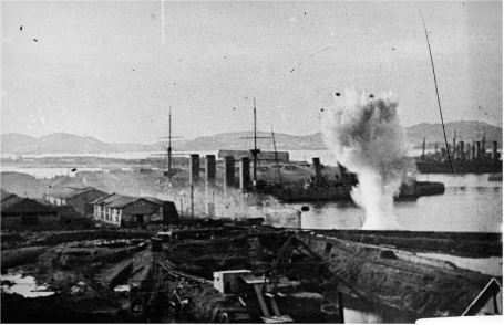 Крейсер Баян и минный заградитель Амур под обстрелом в Порт-Артуре, 1904 год