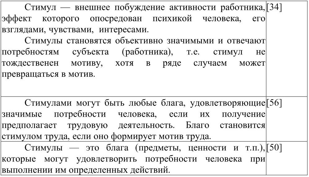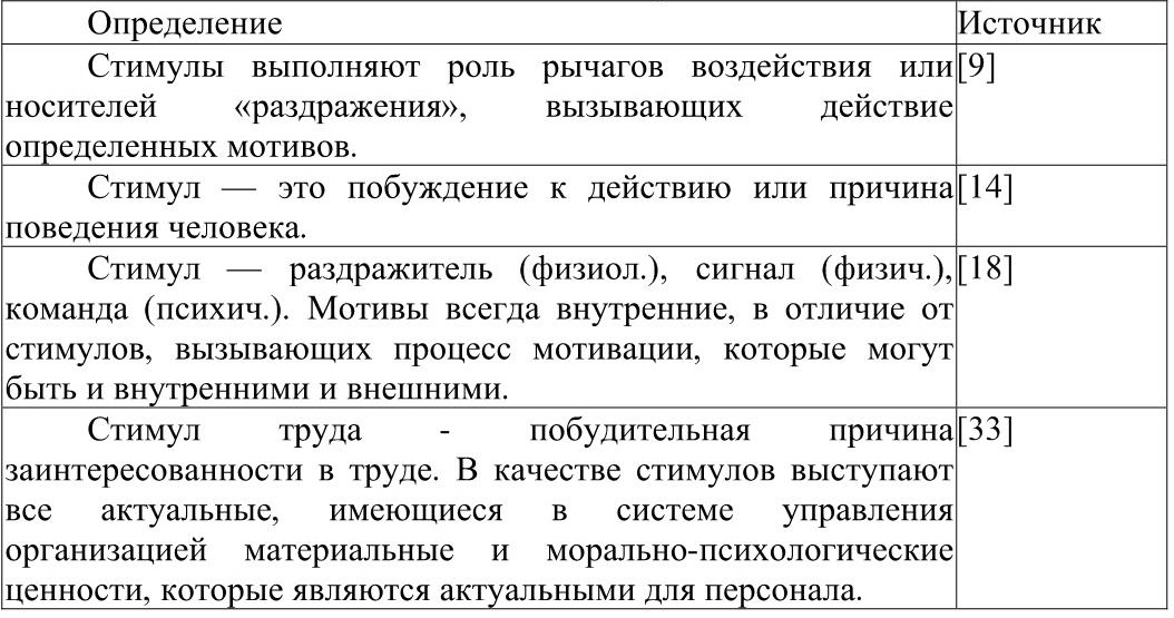 По мнению автора диссертации, данный подход способен привести к замещению одного определения другим, а значит, от его употребления имеет смысл отказаться при проведении исследования. В ходе проведения исследования рассмотрим подходы к пониманию стимула в работах отечественных авторов. При рассмотрении подходов к пониманию отчетливо прослеживается разделение понятий мотива и стимула, на наш взгляд, ключевым различием можно считать тот факт, что стимулы выступают в качестве внешнего побудителя к труду, а мотивы соответственно как побудители внутреннего характера.