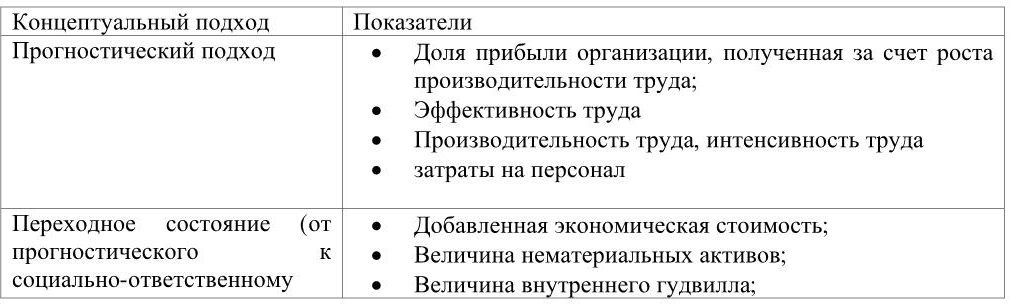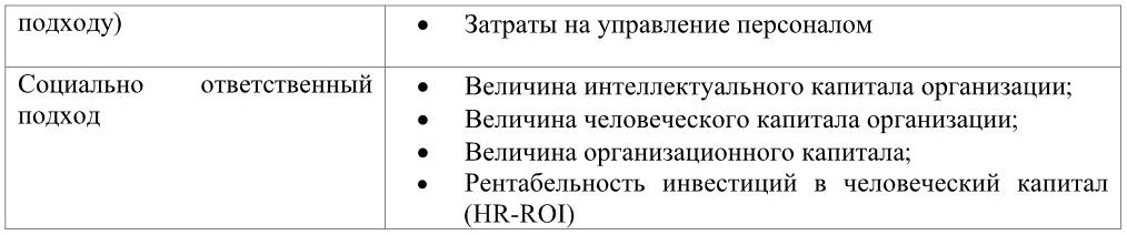 Таблица 3. Показатели, используемые для оценки результативности и эффективности системы управления персоналом в зависимости от концептуального подхода