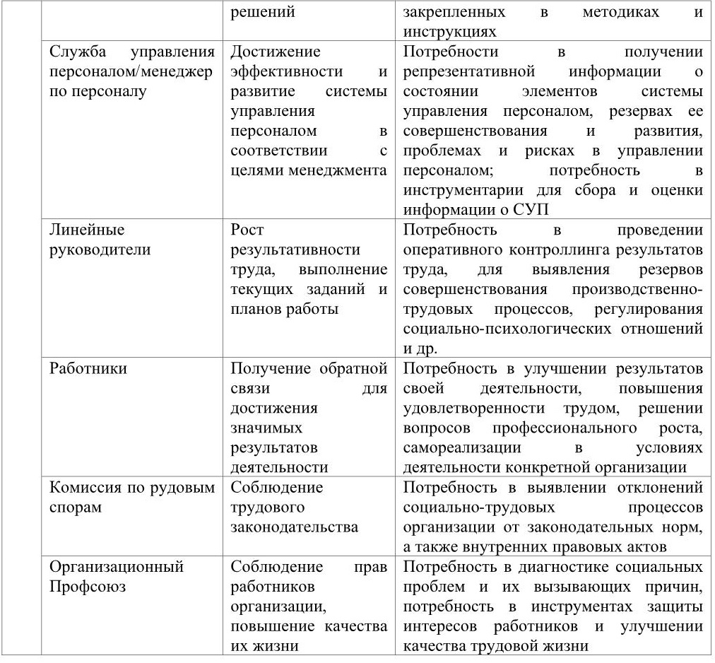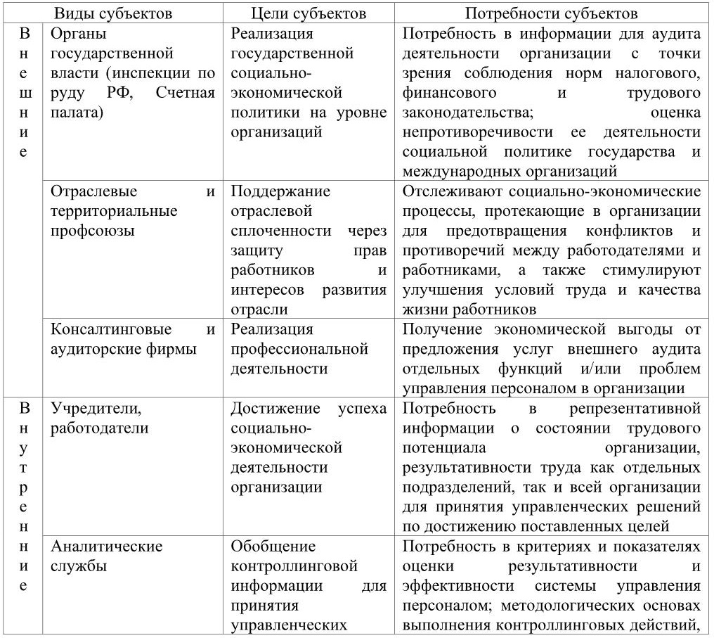 Таблица 4. Субъекты контроллинга персонала, их цели и потребности