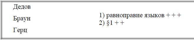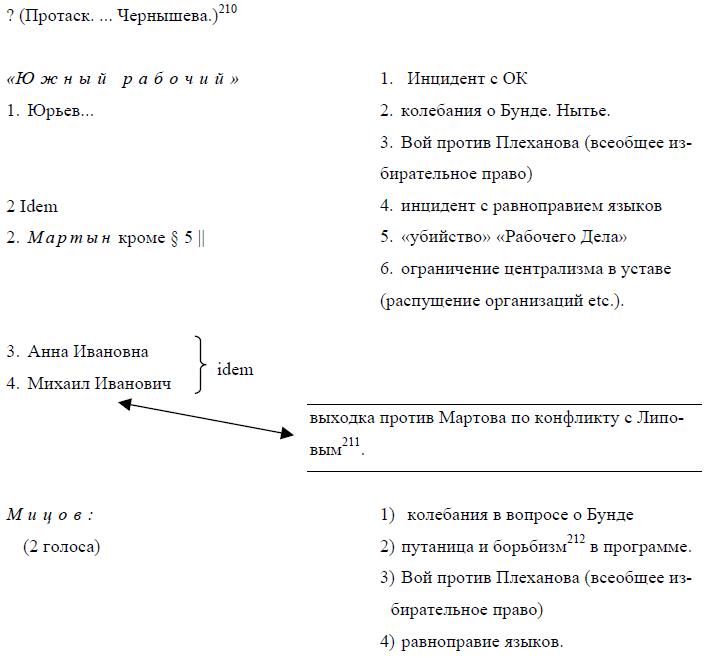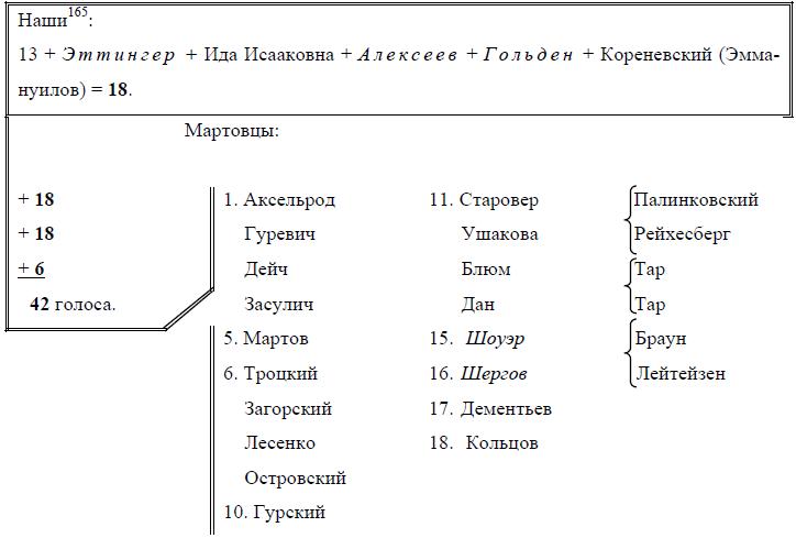 В нижнем правом (крайнем) столбце указаны имена тех шести членов Заграничной лиги, позиция которых на первом заседании не была еще достаточно ясна. В ходе дальнейших заседаний съезда выяснилось, что четверо из названных лиц проявили себя сторонниками меньшевистской оппозиции, а К. М. Тахтарев (Тар), располагавший также голосом А. А. Якубовой (Тар), занял нейтральную позицию.
