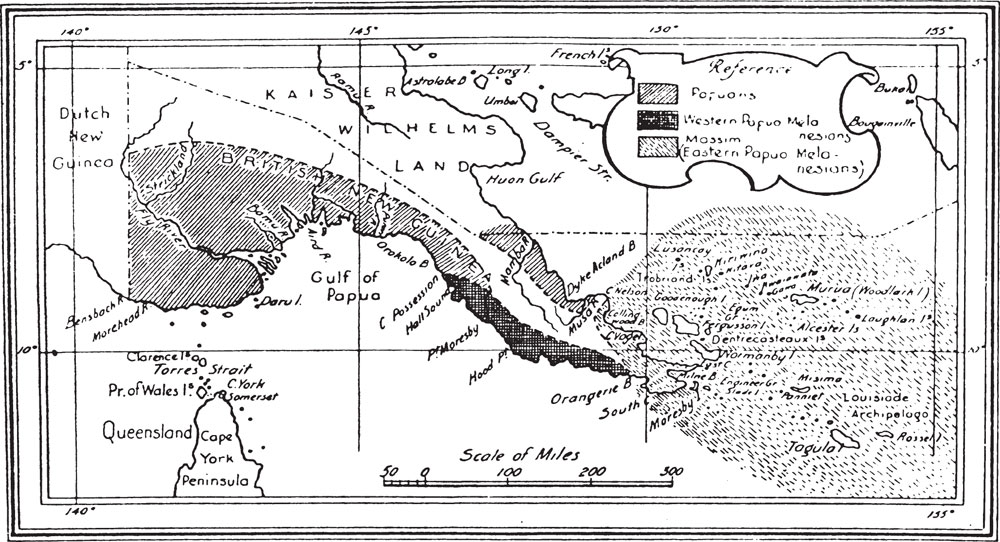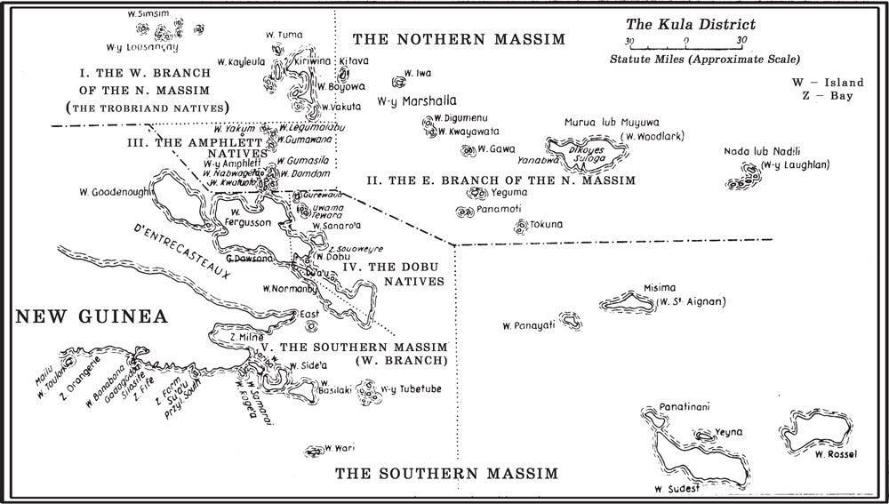 Я полагаю, что читателю известна цитируемая работа Зелигмана, в которой дан подробный отчет об основных типах папуа-меланезийской социологии и культуры. Однако племена восточного папуа-меланезийского ареала (или ареала массим) следует описать тут более детально, поскольку в этом относительно гомогенном районе имеет место обмен кула. И действительно: сфера влияния кула и этнографический район племен района Массим почти полностью совпадают, так что можно говорить о типе культуры кула и культуре массим как о понятиях почти синонимичных.