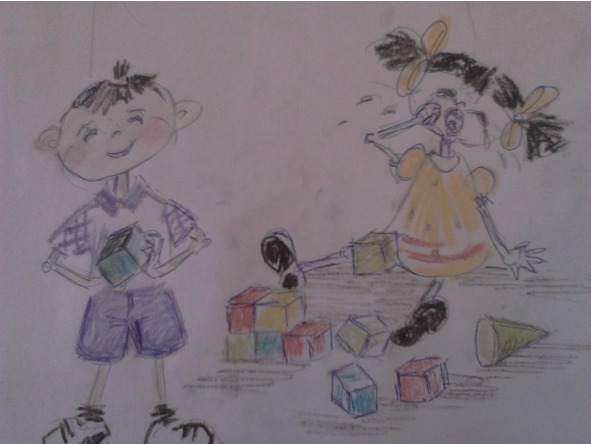– Займись другим, Толик, в кубики играет Маша. У вас достаточно разных игрушек, – ласково отвечает Таня.