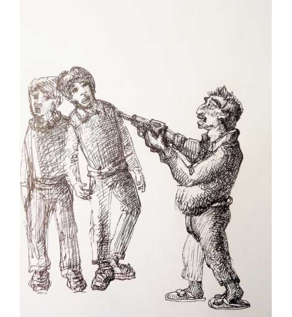 It was getting late when that happened. I was on my way home with my friend Kolya, and we noticed two people screaming at each other: A guy barely standing on his feet and a woman, who was holding him. Suddenly after drunk one had noticed me and my friend he quickly pulled out a gun and aimed it at us saying, “What are you looking at?