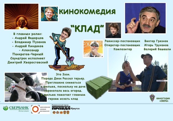 «About one of main characters of the movie. Specialist in digging out of treasures. It is Zezi – the film star. Breed Jack Russell Terrier. She is 2 years old. Very smart dog, well gives in to training, will never give in offense of the master, despite small growth. Has already children – 5 pieces, very careful mother, but only at puppies teeth started being cut through – sharply disaccustomed them to a tit. Then to our surprise I started them teasing, to anger. One dog „Doughnut“ seized it where – that behind an ear. It lay on a floor and couldn’t rise. It appears – from young claws I started working out a grasp at children. Breed hunting – an instinct. It is very vigorous, mobile. Likes to play with children if those start misbehaving, slightly bites them. Nurse. At dacha rushes like mad, digs holes. Eats all vegetables. One trick. On the second floor at us the steep ladder, as by the ship carries. Therefore she goes down, jumping to the master on a shoulder. In the car goes only by a front seat, sharp-sightedly looks forward. Navigator of run. Once I asked to drive to what this frame testifies. The poem is devoted to it, music will be perhaps written».