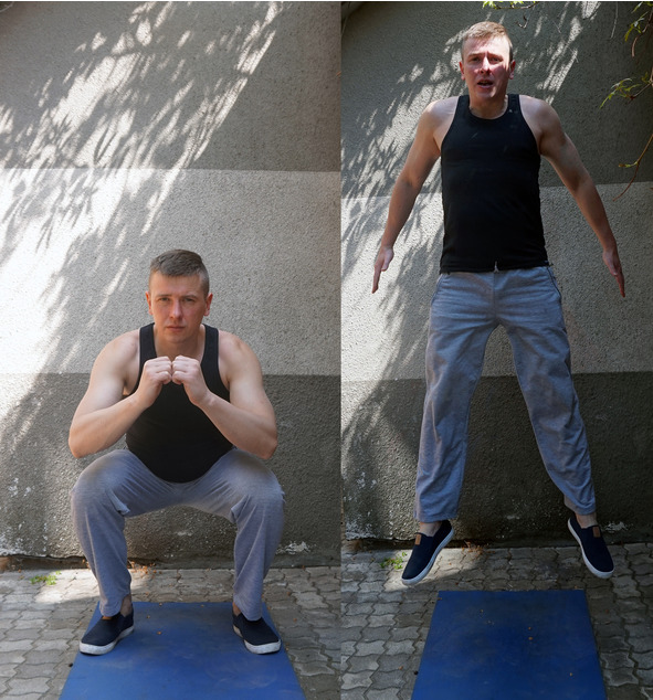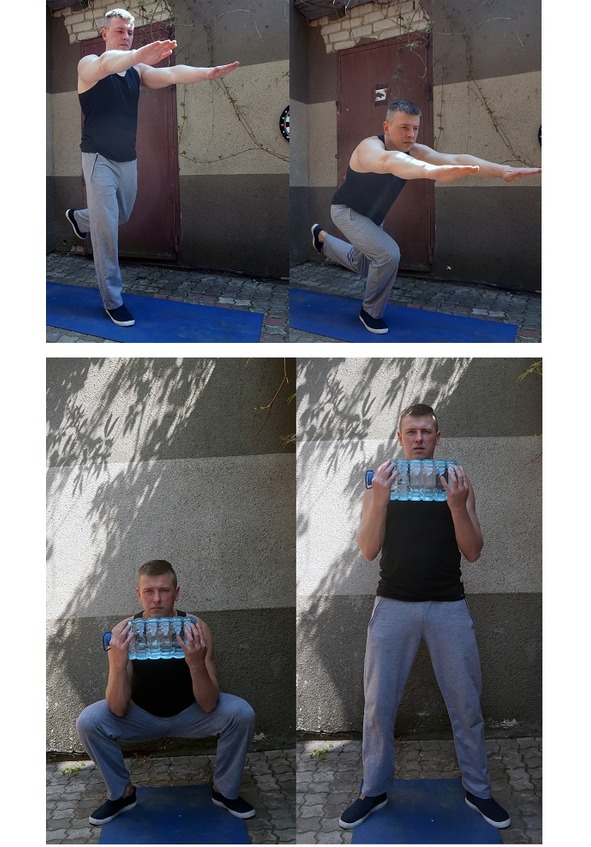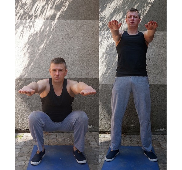 Начнем с классических приседаний с собственным весом. Если очень сложно, то упрощаем. Если легко (чаще всего именно так), то выбираем более сложные формы.