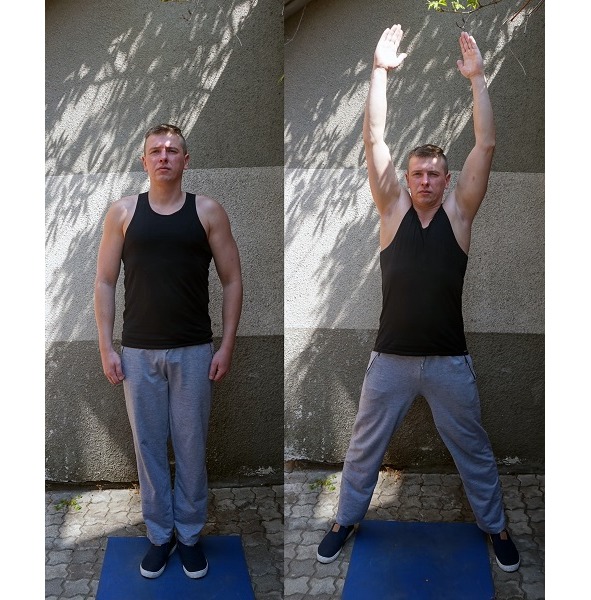 Выполняется просто. Из положения «стоя, руки вдоль корпуса», прыгаете в положение «стоя, ноги чуть шире плеч, руки надо головой». Потом обратно.