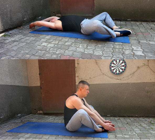 Исходное положение – лежа на спине, голени к бедрам под углом 90 градусов, ступни обеих ног соприкасаются, руки вытянуты за головой. Из этого положения садитесь в вертикальное положение, руки в конечной точке держите прямо перед собой.