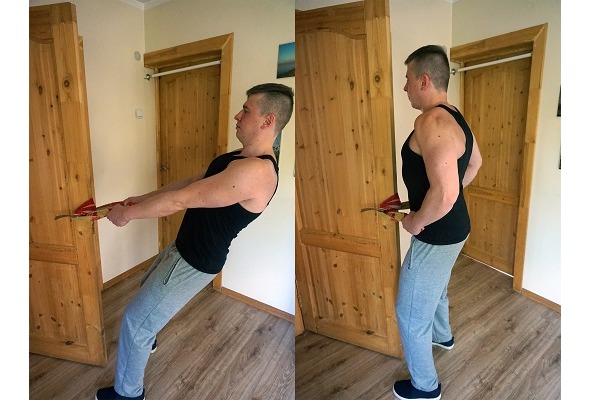 Например, горизонтальная тяга корпуса – это самый простой вид подтягиваний. Беретесь за ручки открытой двери (или вешаете на них полотенце), ноги ставите примерно на уровне косяка, откидываетесь назад и тянете себя к двери.