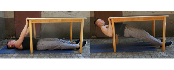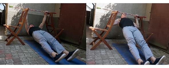 Если нет турника, то можно выполнять горизонтальные подтягивания. Их еще называют «обратной тягой» («inverted row») или «австралийскими подтягиваниями». Кладете палку между двумя стульями, забираетесь под палку, хватаетесь за нее, корпус стараетесь держать прямо и тянете себя к палке. Ноги можно держать в согнутом положении на полу (простой вариант), прямыми на полу (средний вариант), и на возвышении (сложный вариант).