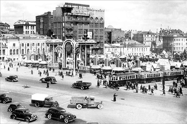 Праздничное оформление Пушкинской площади к 1 мая. Вторая половина 1940-х годов.