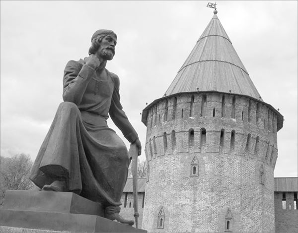 Федор Конь на фоне выстроенного им Смоленского кремля (скульптор О. Комов)