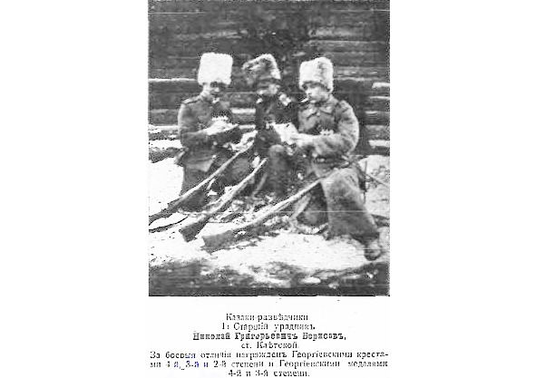 БОРИСОВ Николай Григорьевич (Казак станицы Клетской, хутор Нижне-Затонский, ОВД). – 52 Донской казачий полк, ст. урядник. В Гражданскую войну в Донской армии, в 15 конном полку, подхорунжий. Командир: – Воинов Яков Яковлевич, войсковой старшина, произведен в полковники №1920 от 22.12.1918; в резерв с 21.04.1919 года, приказ №779 от 30.04.1919 года. Награжден Георгиевским крестом 1-й ст., приказ №488 от 18.03.1919 года. Награждён ГК 2 ст. №3001: «За то, что, будучи послан 12.11.1914 на разведку, доставил ценные сведения о противнике, подвергая свою жизнь опасности». Награждён ГК 3 ст. №4921: Вместо креста 4 ст. №172149. Награждён ГК 4 ст. №48694: «За отличия, оказанные в делах против неприятеля». Награждён ГК 4 ст. №172149: «За то, что в ночь с 8-го на 9.10.1914, переправившись на левый берег р. Вислы, по грязному оврагу, ползком пробрался за линию сторожевого охранения австрийцев, там он наткнулся на конную заставу в 0.5 версты от берега и телефонную проволоку, перерезал ее, собрал несколько аршин и, когда был обнаружен противником, не растерялся, а отстреливаясь, прорвался обратно через сторожевое охранение и, вернувшись в полк, доложил точно, что левый берег охраняется австрийской кавалерией».