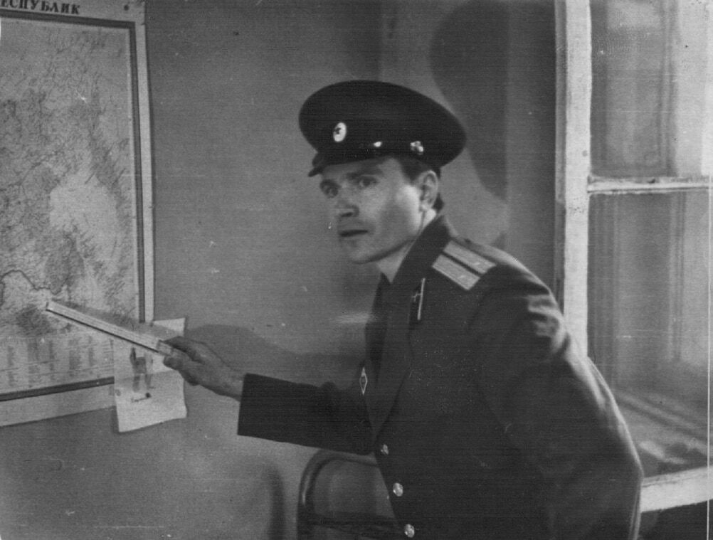 Мы, как собратья по ВУЗу, приняли гостя тепло и радушно. Организовали праздничный стол, перефотографировались на память в его военной форме. Есть фотография «Геноссе» в этой военной форме. Привожу её ниже в данном рассказе. «Геноссе» наклонился над картой СССР, висевшей над моей кроватью, и ищет логарифмической линейкой свою Родину: