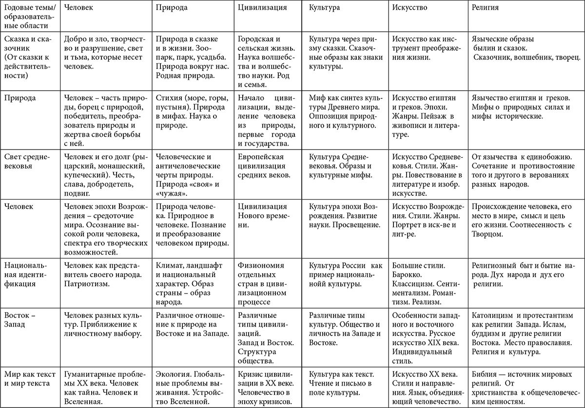 Разумеется, сама по себе матрица мало что может сказать о тех ключевых образах, о которых было сказано ранее, хотя кое-что прочитывается и из таблицы. Например, в 5-м классе идет работа с образами волшебника-творца и семьи (отец – мать – дитя). Понимание образа творца последовательно углубляется и тогда, когда в 8-м классе речь идет о титаническом человеке Возрождения, сопернике Бога, и в 11-м, когда, разбирая библейские и евангельские тексты, мы говорим о Творце в высшем, философском и религиозном смысле. В конечном итоге эта линия вбирает и другую, тоже идущую от 5-го класса (отец – патриарх – Отец). Начиная с примитивной детской картины мира (хочется сказать – картинки мира), на которой значатся Дом, Мать, Отец, Дитя, Дерево, Солнце, мы постепенно углубляем понимание этих символов, усложняем картину, пока в 11-м классе не приближаемся к представлению о реальной сложности мира, к мировоззренческой картине, в которой есть место и расширяющейся вселенной, и суперструнам, и глобальным проблемам человечества, и частным проблемам человека. И при этом каждый из предметов (а их вовсе не обязательно отменять) работает на смысловое обогащение каждого из символов и в тесной связке с остальными.